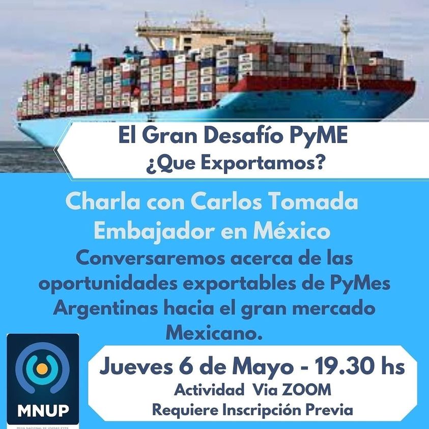 Convocado por la Mesa Nacional de Unidad PYME (MNUP) se lleva adelante el 6 de Mayo la primer reunión con el Embajador Argentino en México Carlos Tomada, para participar es necesario realizar la inscripción ingresando en el siguiente link y le enviaremos el vinculo para acceder al zoom