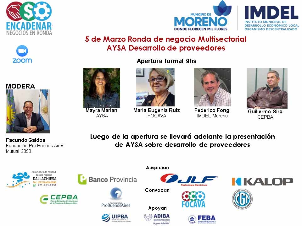 ENCADENAR Negocios en Ronda, Municipio de Moreno, IMDEL, Instituto Municipal de Desarrollo Económico Local Organismos Descentralizados. se llevará a acabo el día 5 de marzo la Ronda de Negocios Multisectorial AYSA sobre desarrollo de proveedores.